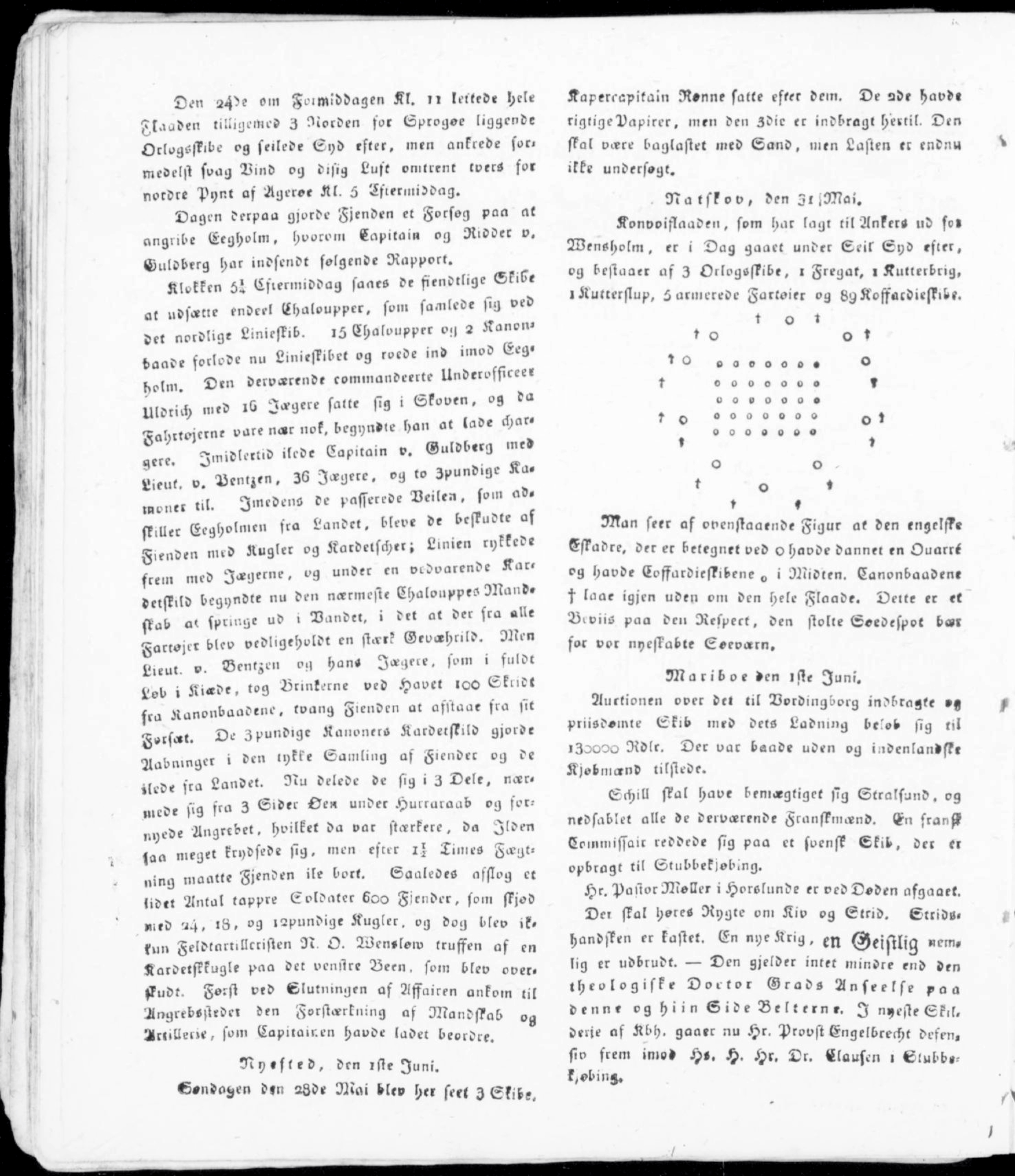 Som avisen skriver: Man ser af den ovenstående figur, at den engelske eskadre havde dannet en Duarré. Dette er et bevis på den respekt den stolte sødespot bærer for vor nyskabte søværn.